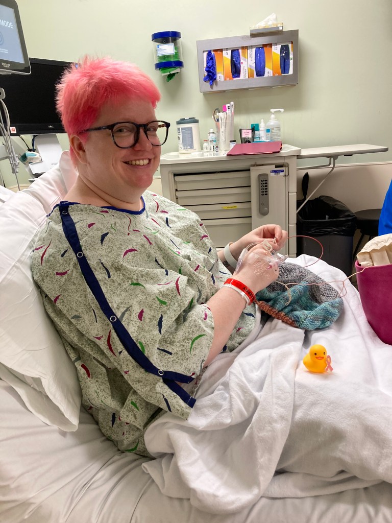 If you’re not the first surgery of the day, then your surgery might not happen at the scheduled time. It can be frustrating, because it’s your one big thing happening that day, and you might be having all kinds of emotions waiting for it. On top of that, you’ll be hungry and thirsty. Remind yourself that everyone else wants you in that operating room just as much as you do, and they don’t like delays, either. This is why I brought my knitting and yeah, okay, having a clearer head maybe helped with passing the time.